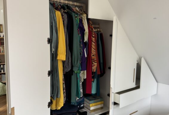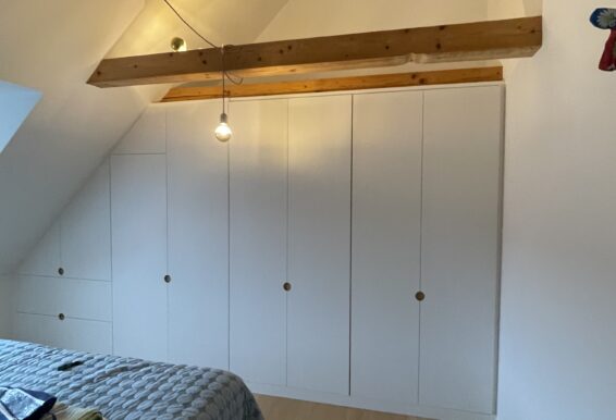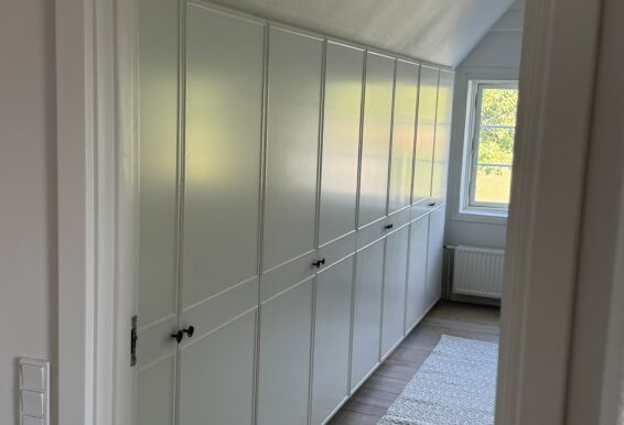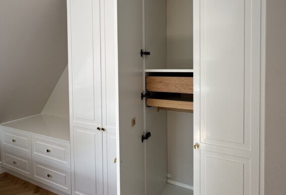 Vi designer og fremstiller snedkergarderobeskabe til skråvægge i alle dybder, højder og bredder, og vi sørger derfor for, at skabet udnytter pladsen under dine skråvægge optimalt