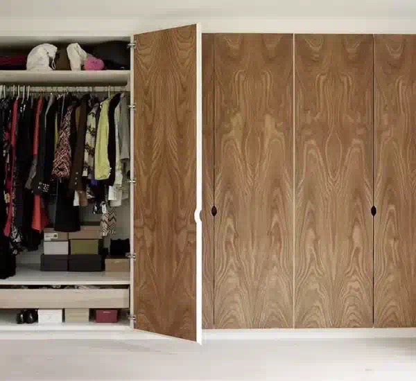 Kan laves på dine mål og i den farve eller træsort du måtte ønske. Dette skab har 5 indvendige snedkerskuffer i massiv ask, 6 hylder og 3 bøjlestænger og koster inkl. dørene i elmetræ kr. 58.650,- montering kr. 12.200,- inkl. moms